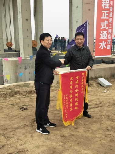 為慶祝工程基本完工并開始試通水,項(xiàng)目行政主管單位河北省水利廳在沉沙池進(jìn)口舉辦了簡單的引黃入冀補(bǔ)淀工程通水儀式,河南省水利廳、黃河水利委員會、濮陽市人民政府以及各參建單位共百余人參加了通水儀式。我公司趙廷華副總經(jīng)理及現(xiàn)場設(shè)代作為設(shè)計(jì)方代表參加了該儀式。