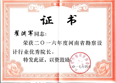 為樹(shù)立典型,表彰先進(jìn),進(jìn)一步調(diào)動(dòng)河南省全行業(yè)勘察設(shè)計(jì)人員的積極性,促進(jìn)行業(yè)健康發(fā)展,河南省勘察設(shè)計(jì)協(xié)會(huì)開(kāi)展行業(yè)突出貢獻(xiàn)、行業(yè)優(yōu)秀企業(yè)和行業(yè)優(yōu)秀院長(zhǎng)的評(píng)選。我公司被河南省勘察設(shè)計(jì)協(xié)會(huì)評(píng)為“2016年度河南省勘察設(shè)計(jì)行業(yè)突出貢獻(xiàn)獎(jiǎng)企業(yè)”,翟淵軍董事長(zhǎng)再次榮獲“2016年度河南省勘察設(shè)計(jì)行業(yè)優(yōu)秀院長(zhǎng)”。
