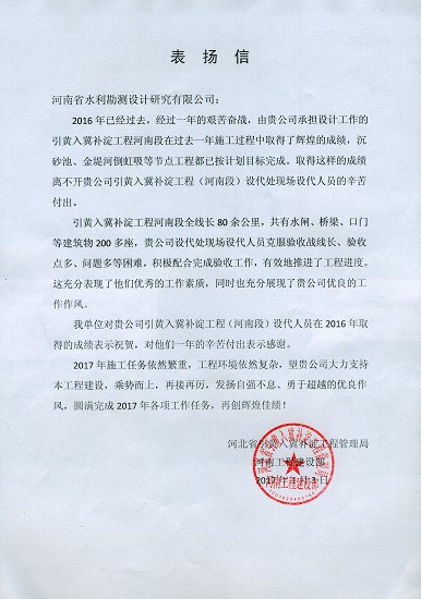 近日,公司收到引黃入冀補淀工程管理局河南工程建設部發(fā)來的熱情洋溢的表揚信,對公司為引黃入冀補淀工程2016年度建設工作的支持和配合表示衷心的感謝,對公司派駐現(xiàn)場設代2016年度的技術服務工作給予肯定,對設代人員頂風冒雪、放棄假日奮戰(zhàn)在工程建設第一線的辛勤付出充分認可,對豫水設計人的工作素質(zhì)和敬業(yè)精神提出了表揚,并希望設代人員在2017年的設代工作中再接再勵、續(xù)寫輝煌。