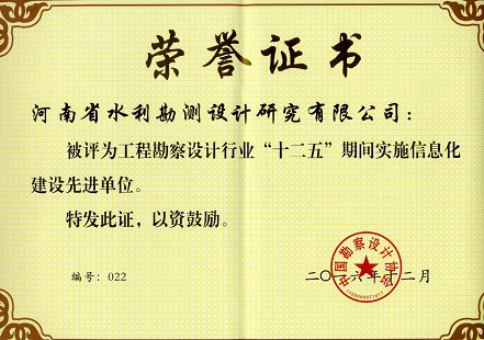 “十二五”期間,我公司以信息化為企業(yè)發(fā)展的重要原動(dòng)力,先后在綜合信息平臺建設(shè)、三維協(xié)同設(shè)計(jì)平臺建設(shè)、水利信息化業(yè)務(wù)拓展等方面取得了長足的發(fā)展,公司管理水平、規(guī)劃設(shè)計(jì)產(chǎn)品質(zhì)量、公司業(yè)務(wù)拓展等實(shí)現(xiàn)了跨越式發(fā)展,得到了業(yè)內(nèi)的認(rèn)可,被中國勘察設(shè)計(jì)協(xié)會評為工程勘察設(shè)計(jì)行業(yè)“十二五”期間實(shí)施信息化建設(shè)“先進(jìn)單位”!數(shù)字工程中心主任高英獲得 “先進(jìn)個(gè)人”榮譽(yù)稱號!