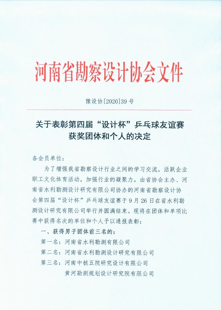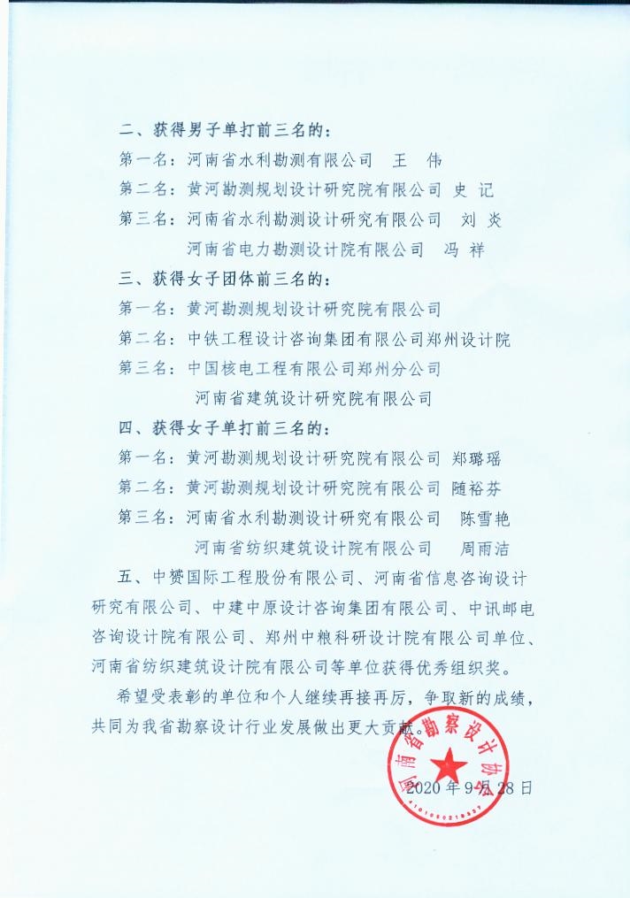 秋高氣爽,金桂飄香,為加強我省勘察設計行業(yè)職工的學習交流,活躍職工業(yè)余文化生活,增強行業(yè)的凝聚力,在雙節(jié)來臨之際,由河南省勘察設計協(xié)會主辦、我公司協(xié)辦的河南省勘察設計協(xié)會第四屆“設計杯”乒乓球友誼賽于2020年9月26日在我公司成功舉辦。