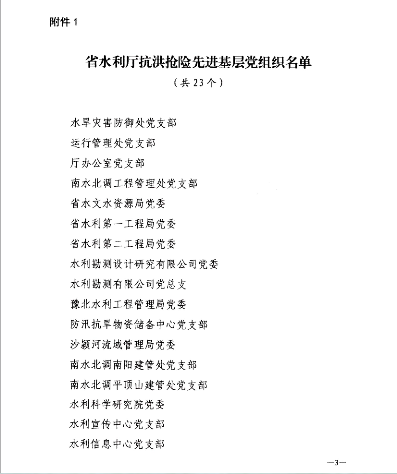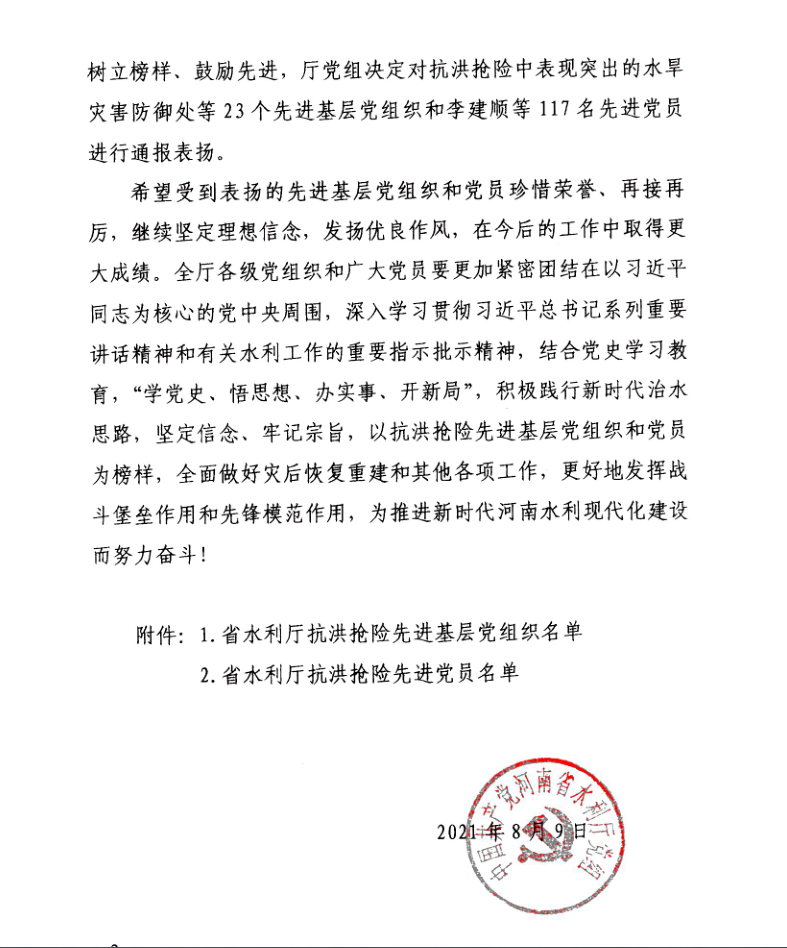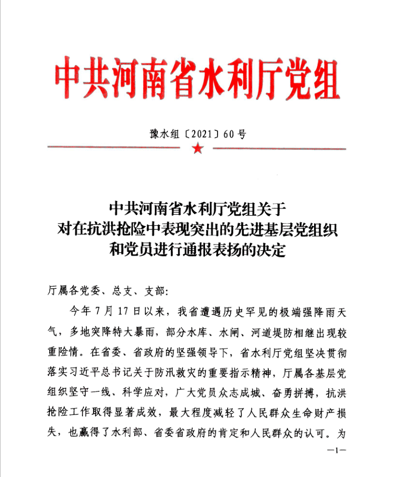 8月9日,省水利廳黨組以豫水組【2021】60號(hào)文下發(fā)了《關(guān)于對在抗洪搶險(xiǎn)中表現(xiàn)突出的先進(jìn)基層黨組織和黨員進(jìn)行表彰的決定》,公司黨委作為省水利廳抗洪搶險(xiǎn)先進(jìn)基層黨組織,翟淵軍、朱太山、趙廷華、楊華軍、王志軍、陳輝、張明恩、劉蘭勤等8名黨員同志作為省水利廳抗洪搶險(xiǎn)先進(jìn)黨員受到通報(bào)表揚(yáng)。