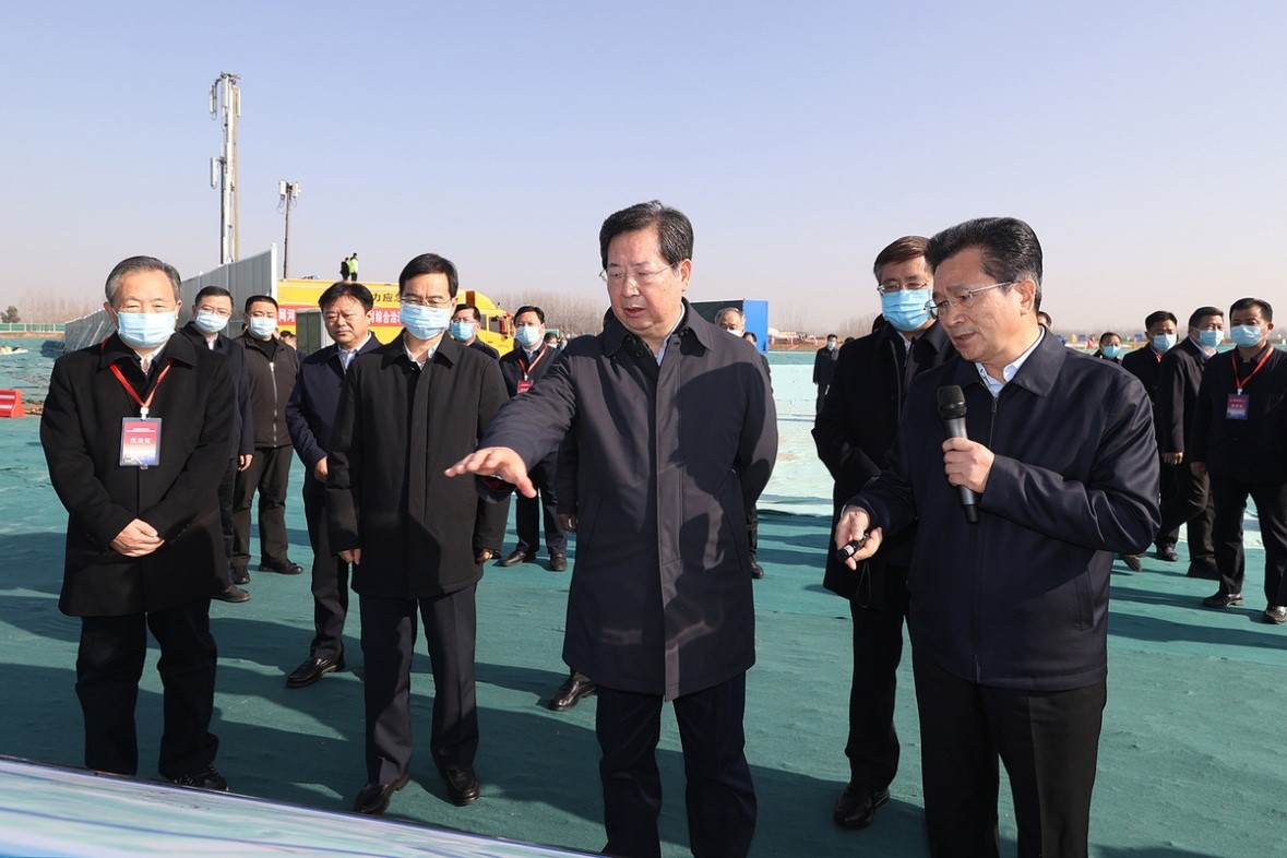 開工動員會后,樓陽生、王凱來到賈魯河綜合治理工程施工現(xiàn)場,實地察看了導(dǎo)流明渠工程、上下游圍堰、河槽疏浚段、永久堤防標(biāo)準(zhǔn)段規(guī)劃施工情況。
