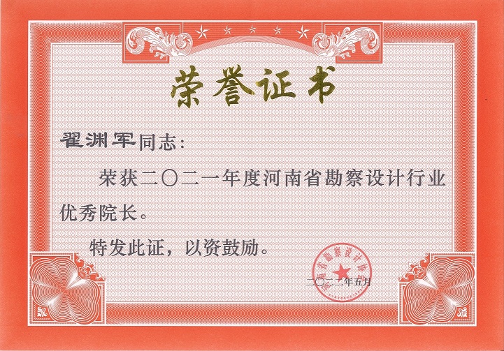大會還對2021年表現(xiàn)優(yōu)秀的勘察設(shè)計企業(yè)、院長頒發(fā)了榮譽證書。公司被評為2021年度河南省勘察設(shè)計行業(yè)先進(jìn)企業(yè),翟淵軍董事長榮獲2021年河南省勘察設(shè)計行業(yè)優(yōu)秀院長。