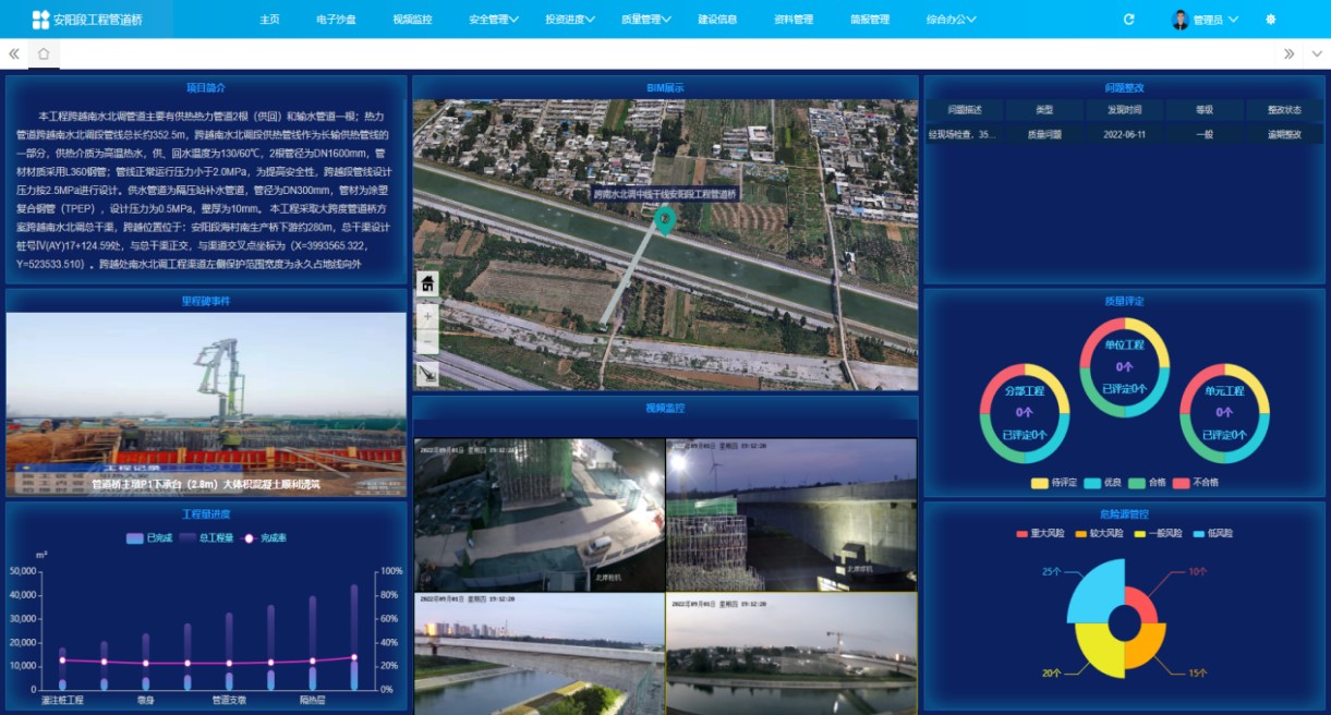 豫水設(shè)計(jì)公司工程管理院負(fù)責(zé)項(xiàng)目管理工作,把重心放在項(xiàng)目策劃和實(shí)施階段,集中力量分析管道橋工程實(shí)施的難點(diǎn)、工程風(fēng)險、疫情防控壓力等,科學(xué)合理的制定管理計(jì)劃,充分發(fā)揮南水北調(diào)中線總干渠工程主設(shè)單位的技術(shù)優(yōu)勢,開發(fā)了基于BIM和大數(shù)據(jù)技術(shù)的項(xiàng)目信息化管理平臺,建立了工程三維虛擬模型,融合現(xiàn)場各維度的管理數(shù)據(jù),為管理決策提供實(shí)時、便捷、高效的信息化技術(shù)支撐。
