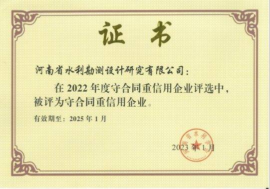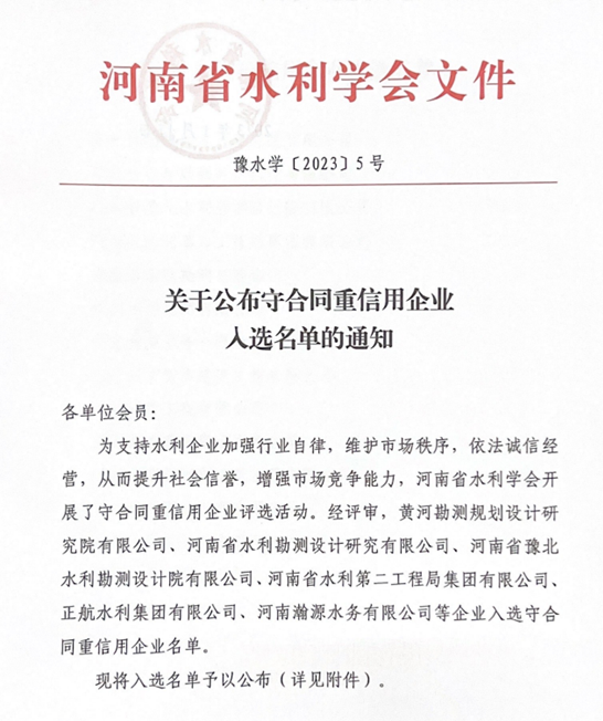 近日,河南省水利學(xué)會公布守合同重信用企業(yè)入選名單,豫水設(shè)計公司被評為“守合同重信用企業(yè)”。