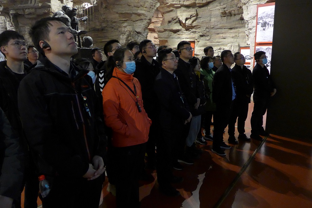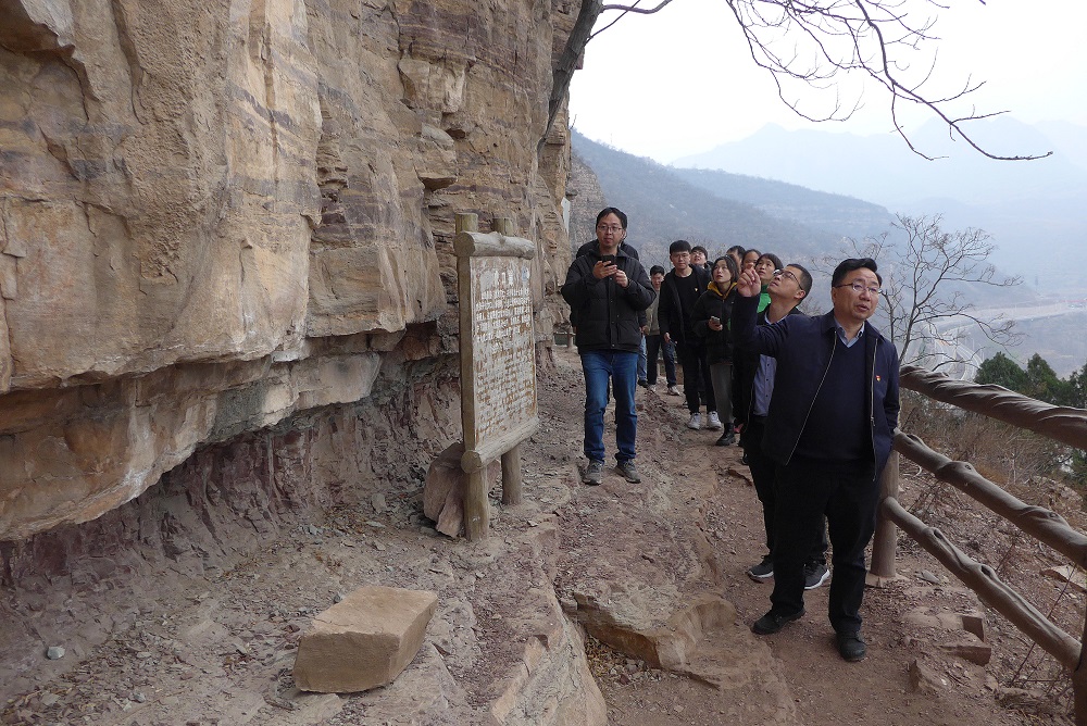 在青年洞,大家沿著“創(chuàng)業(yè)路”拾級而上,追憶著半個多世紀(jì)前先輩們在此奮斗的足跡:在紅旗渠修建過程中,300名青年組成突擊隊,經(jīng)過1年5個月的奮戰(zhàn),將地勢險要、石質(zhì)堅硬的巖壁鑿?fù)?,這個輸水隧洞被命名為青年洞。青年洞現(xiàn)場,面對鮮艷的五星紅旗,全體黨員舉起右拳,在支部書記楊華軍的帶領(lǐng)下,重溫入黨誓詞,堅定了我們緊跟總書記的步伐,奮進(jìn)新征程的信念和決心。