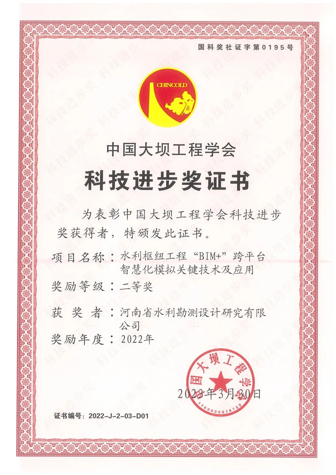 公司數(shù)字工程院深耕BIM+技術(shù)在水利行業(yè)的應(yīng)用,牽頭完成的科研成果“水利樞紐工程“BIM+”跨平臺智慧化模擬關(guān)鍵技術(shù)及應(yīng)用”喜獲2022年度中國大壩工程學會科技進步獎二等獎。