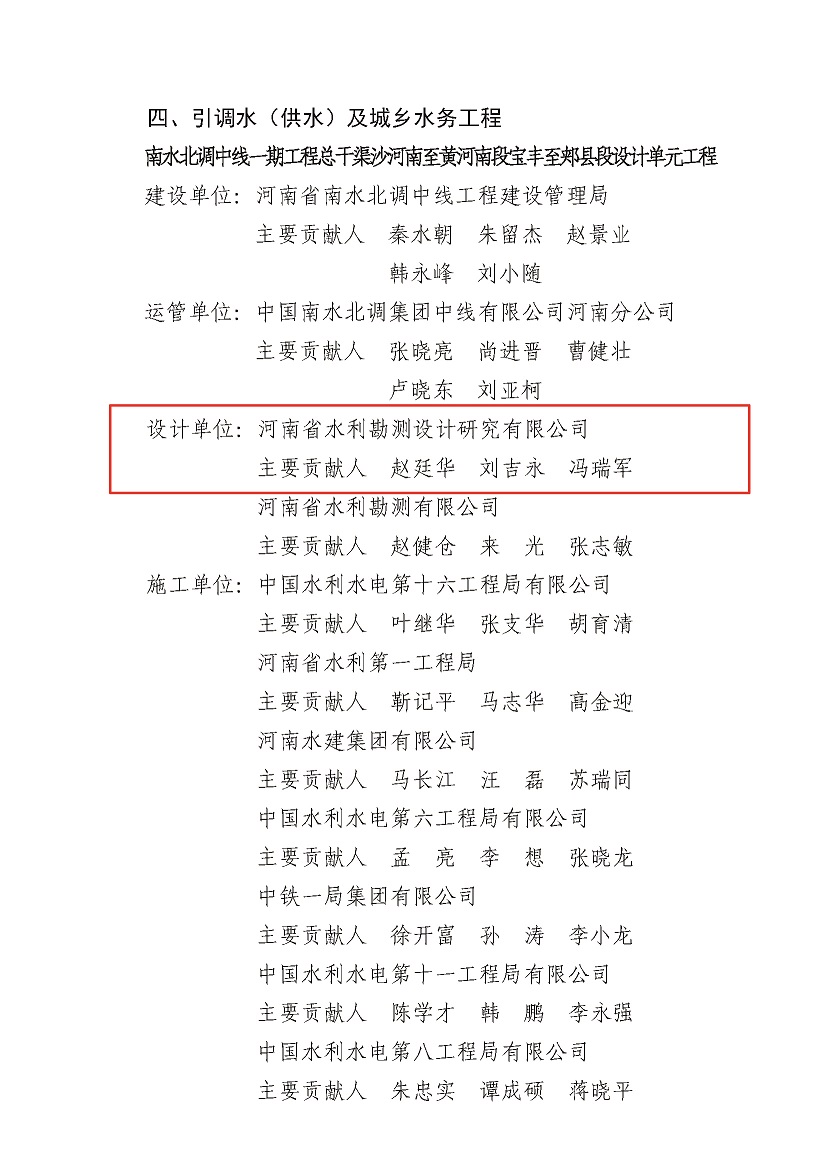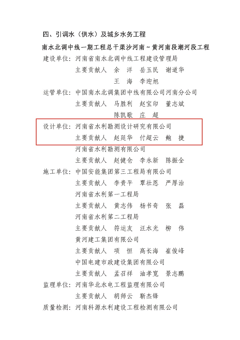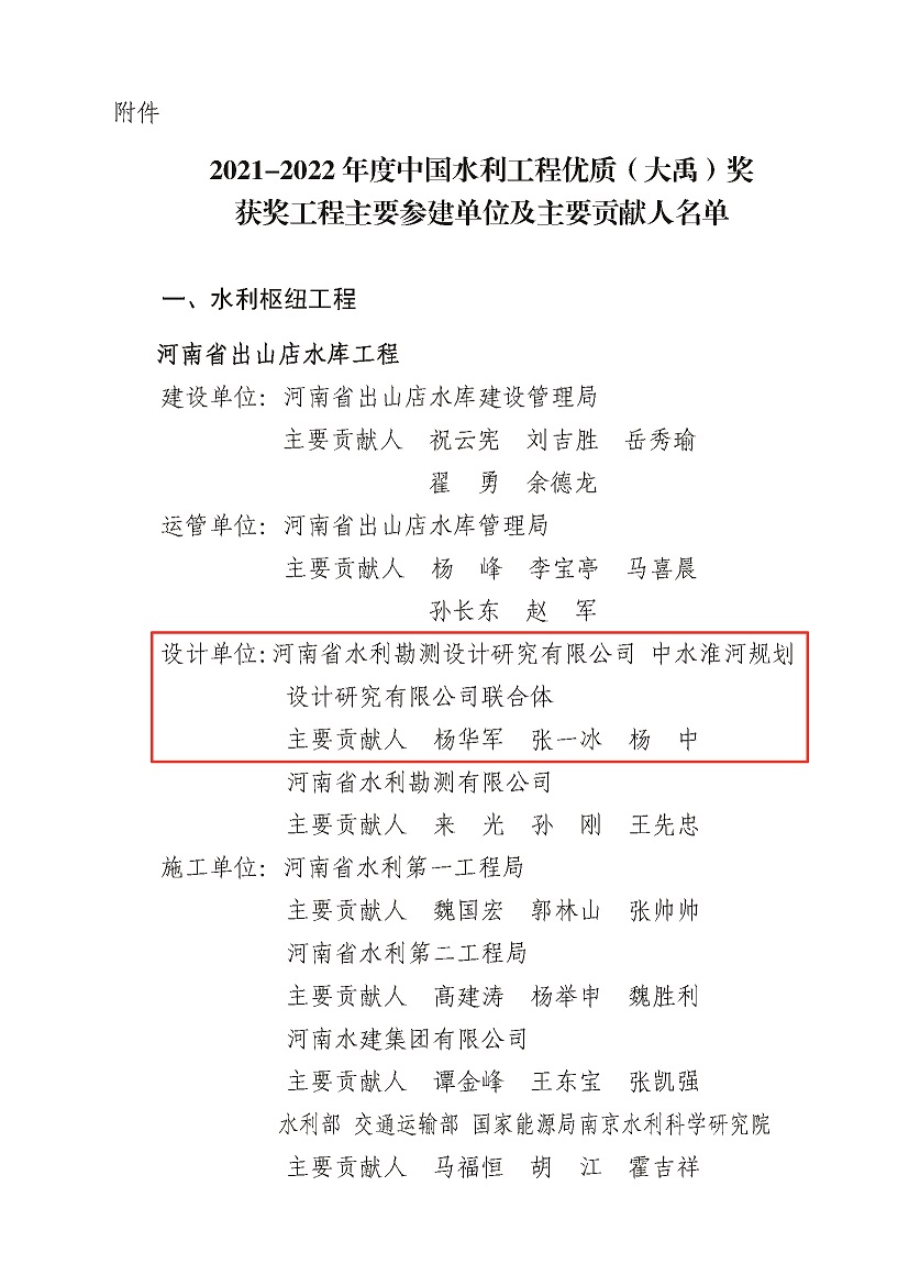 近日,經(jīng)中國(guó)水利工程優(yōu)質(zhì)(大禹)獎(jiǎng)評(píng)審委員會(huì)評(píng)審及公示,公司參與設(shè)計(jì)的《河南省出山店水庫(kù)工程》《南水北調(diào)中線(xiàn)一期工程總干渠沙河南~黃河南段潮河段工程》《南水北調(diào)中線(xiàn)一期工程總干渠沙河南至黃河南段寶豐至郟縣段設(shè)計(jì)單元工程》三項(xiàng)工程榮獲2021-2022年度中國(guó)水利工程優(yōu)質(zhì)(大禹)獎(jiǎng)。