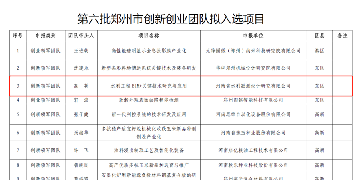 近日,根據(jù)鄭州市科技局“第六批鄭州市創(chuàng)新創(chuàng)業(yè)團隊項目擬入選項目公示”,我公司副總經(jīng)理高英帶領(lǐng)團隊開展的“水利工程BIM+關(guān)鍵技術(shù)研究與應(yīng)用”入選2023年第六批鄭州市“創(chuàng)新領(lǐng)軍團隊項目”。