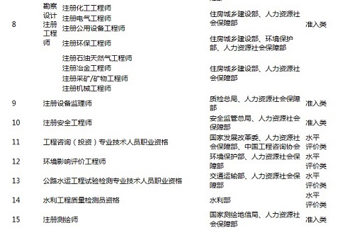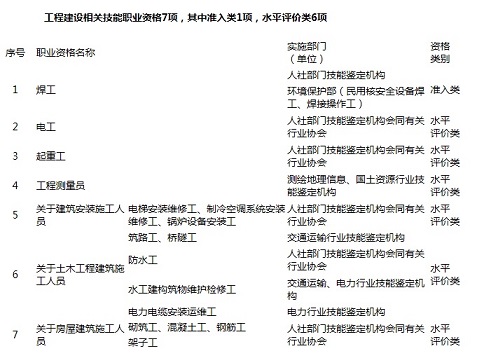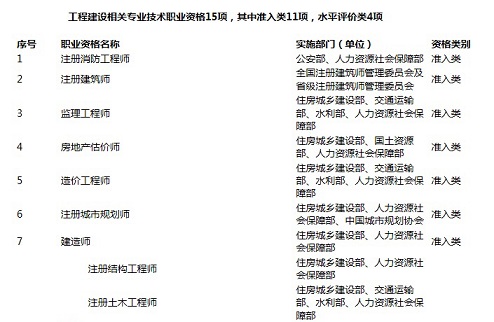 與工程建設(shè)相關(guān)的共22項(xiàng),其中,專業(yè)技術(shù)人員職業(yè)資格15項(xiàng),技能人員職業(yè)資格7項(xiàng),具體見下表。