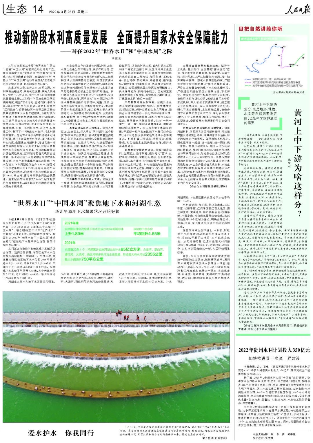 3月22日是第三十屆“世界水日”,第三十五屆“中國水周”的宣傳活動也同時開啟。聯(lián)合國確定今年“世界水日”的主題是“珍惜地下水,珍視隱藏的資源”,我國紀念今年“世界水日”“中國水周”活動的主題是“推進地下水超采綜合治理復(fù)蘇河湖生態(tài)環(huán)境”。